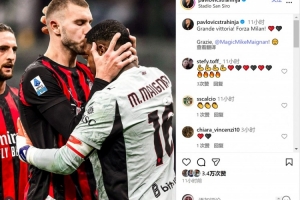 帕夫洛维奇社媒晒出亲吻迈尼昂的照片,配文:“伟大的胜利,加油米兰!谢谢你,迈尼昂。”