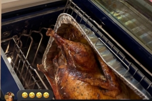 詹姆斯晒出了自家的宠物狗盯着刚刚烤制出炉的感恩节火鸡的表情,并写道:“心情”