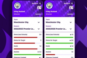 体育资讯11月18日讯 Squawka统计了哈兰德22-23赛季(英超36球)和本赛季的数据,并做出对比。