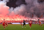 下半场开始时,蒙面的拜仁死忠在慕尼黑南看台举起了将近90支红色和亮色的烟火。