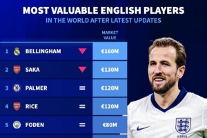 英格兰球员最新身价榜:贝林压萨卡居首,帕尔默、赖斯并列第三