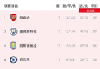 阿森纳积39分排名第一,曼城37分排名第二,切尔西与利物浦排名第四与第五;