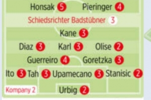 体育资讯12月22日讯 德甲第15轮比赛,拜仁客场4-0击败海登海姆,德国媒体《图片报》对球员进行评分,乌尔比希、奥利塞、斯坦尼西奇2分最高。