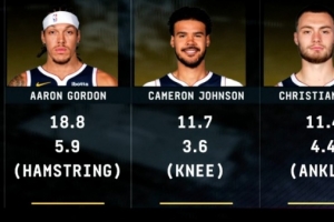 注:戈登腘绳肌受伤 场均18.8分5.9篮板