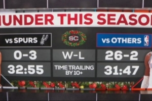 雷霆赛季至今打马刺:0胜3负 落后两位数时间32分55秒