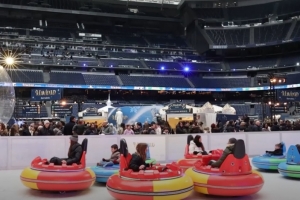 该活动将持续至12月31日,原本的比赛草坪被改造成一个游乐广场,设有白色旋转木马、巨型滑雪橇坡道以及各类美食集市。
