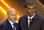 颁奖典礼上,亚马尔获得了2025年度西甲最佳U23球员奖,巴萨传奇伊涅斯塔亲自为亚马尔颁发了奖杯。