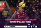 据OPTA统计,该媒体统计了利物浦的定位球丢球数。