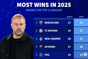 体育资讯1月1日讯 2025年已经结束,《转会市场》也统计了本年度五大联赛胜场最多情况,巴萨独自居首。
