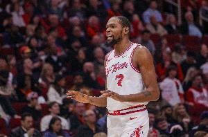 火箭球星杜兰特战旧主上半场三分没开,他出战19分钟,10投5中,三分3中0,罚球2中2,得到了12分3篮板6助攻,正负值+6。