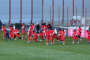 体育资讯1月3日讯 据记者Kerry Hau报道,穆西亚拉参加拜仁训练之前的热身。
