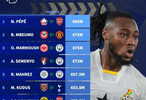 英超非洲球员转会榜佩佩8000万欧居首,姆伯莫7500万欧次席