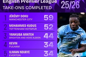 英超成功过人榜:多库压库杜斯居首,萨卡、塞梅尼奥、库尼亚在列
