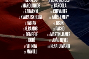 巴黎法国杯大名单:登贝莱领衔,杜埃、维蒂尼亚、K77在列